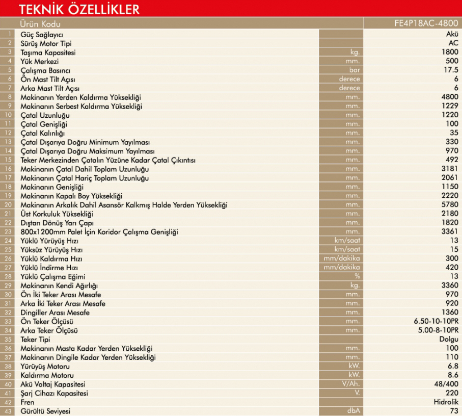 1800 kg Taşıma kapasitesi ve 6000 mm kaldırma yüksekliğine sahiptir.